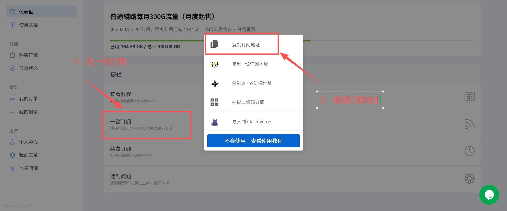 2,返回官網www.fishmix70.art登錄回自己ID點擊一鍵訂閱,複製訂閱地址(需要購買了訂閱才有訂閱地址)
